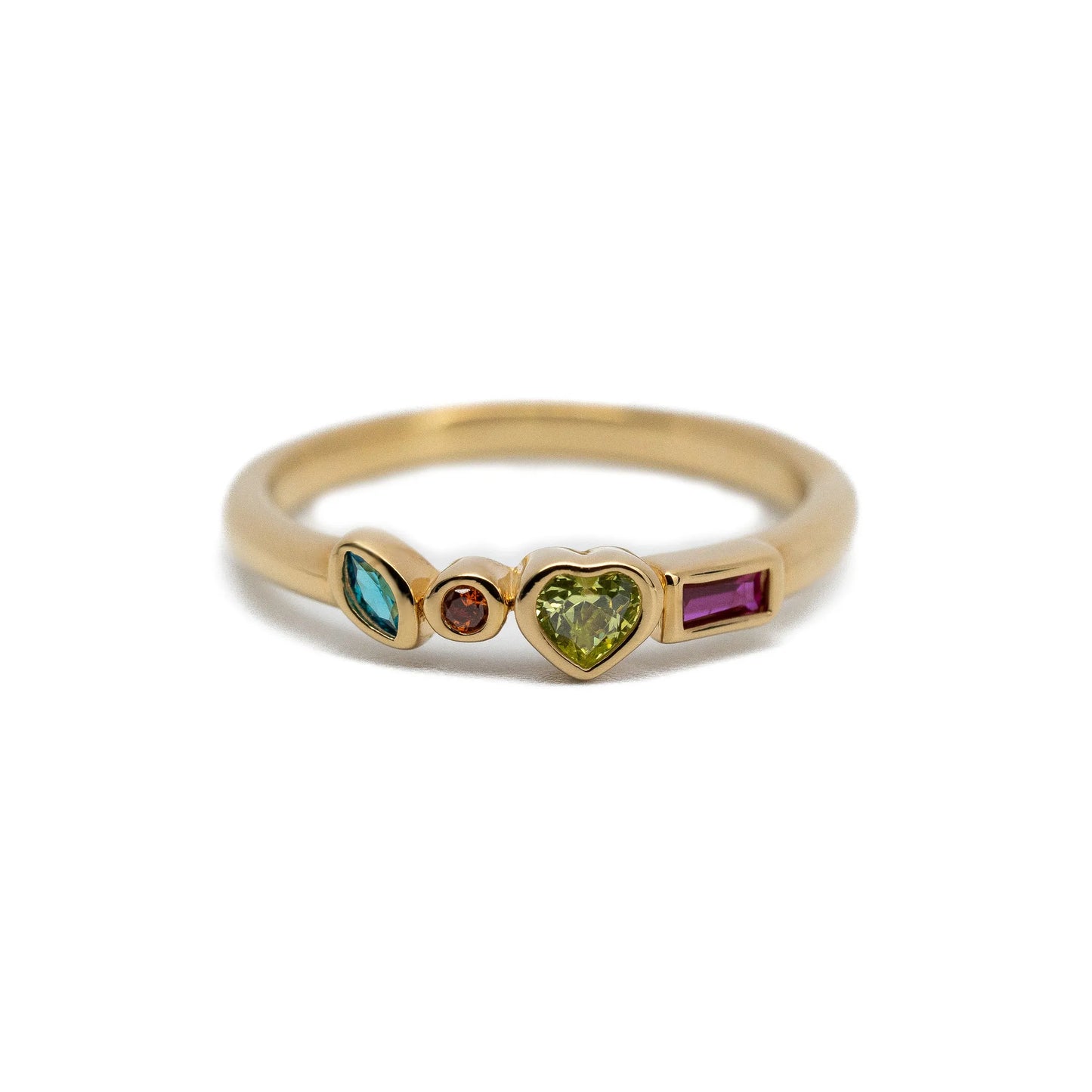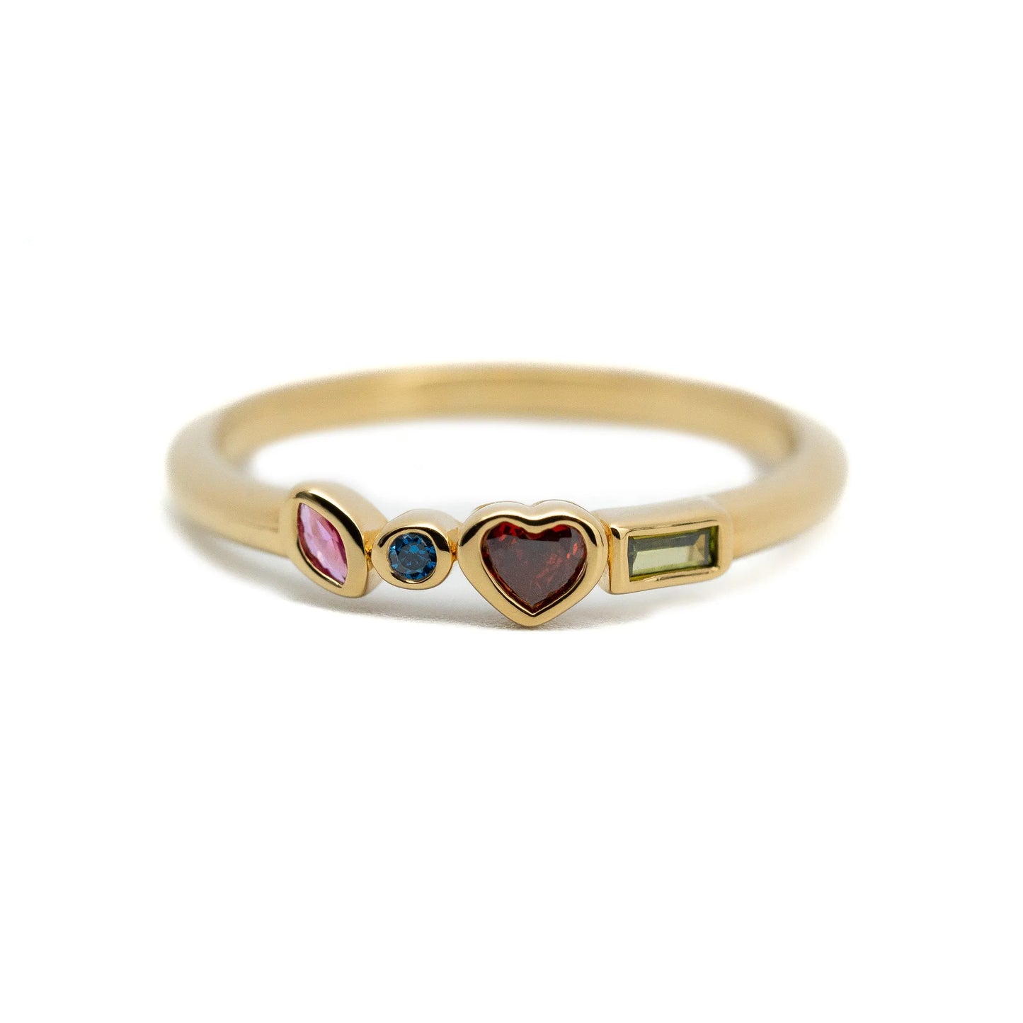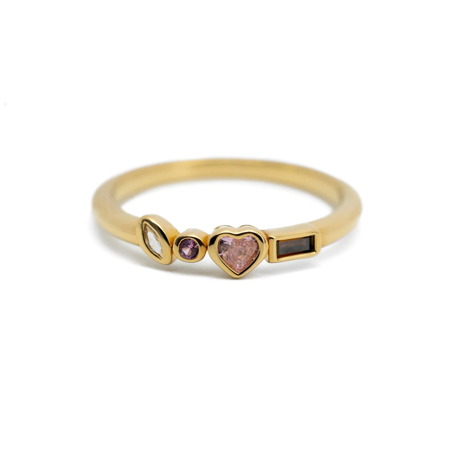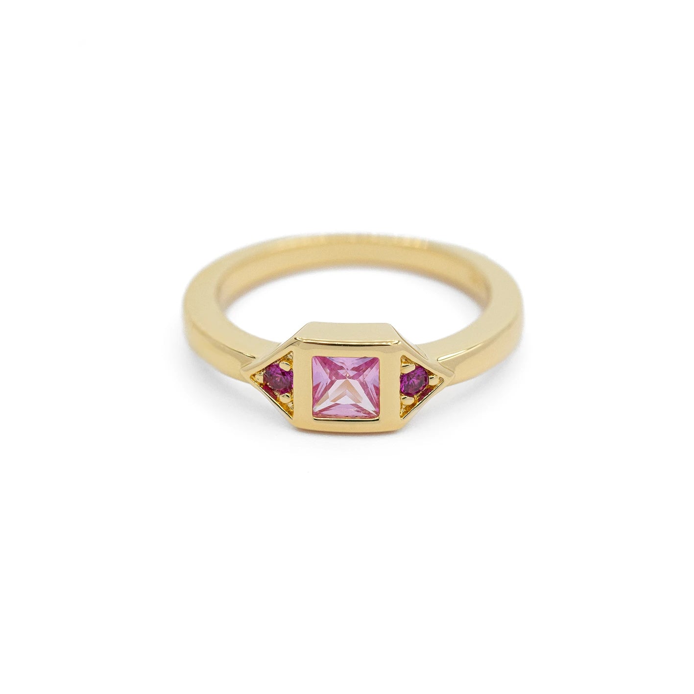 Bague femme plaquée or sertie d'une pierre de zircon couleur Fuchsia sur fond blanc