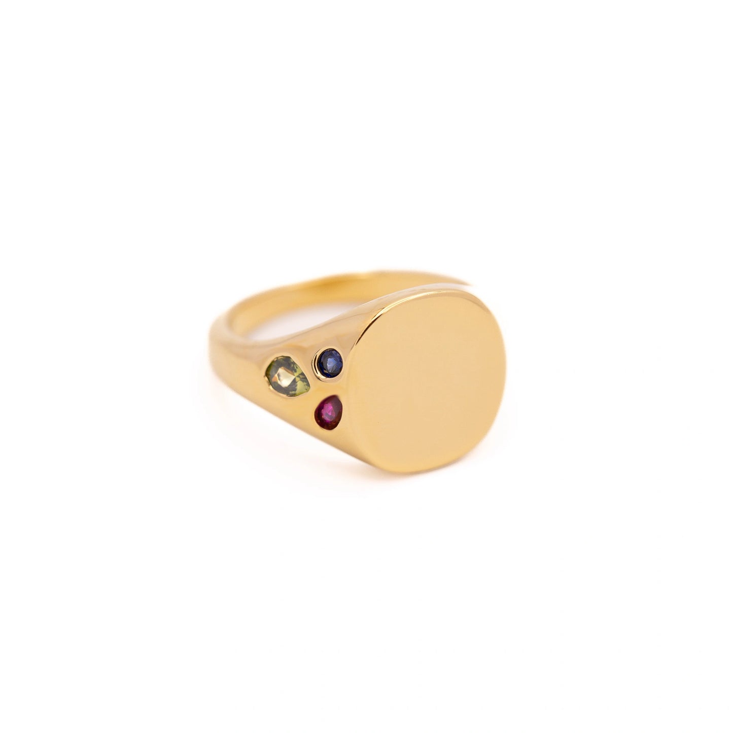 bague chevalière femme collection joie plaquée or sertie de zircons de couleurs bleus roses et cristales sur fond blanc