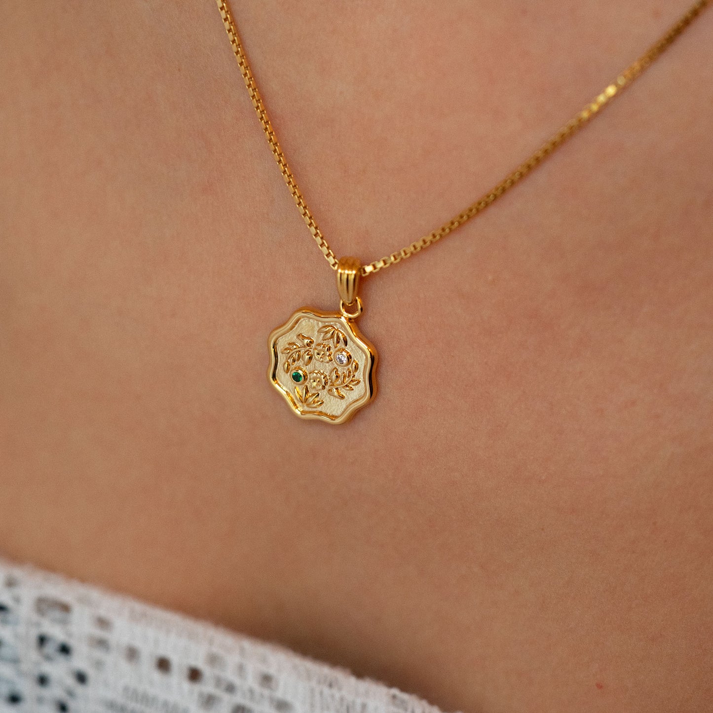Les pierres zircons émeraude et cristal apportent un éclat subtil et lumineux, tandis que le plaqué or 18K garantit durabilité et résistance à l’eau. Légère et intemporelle, cette médaille se porte aisément au quotidien comme pour des occasions spéciales.