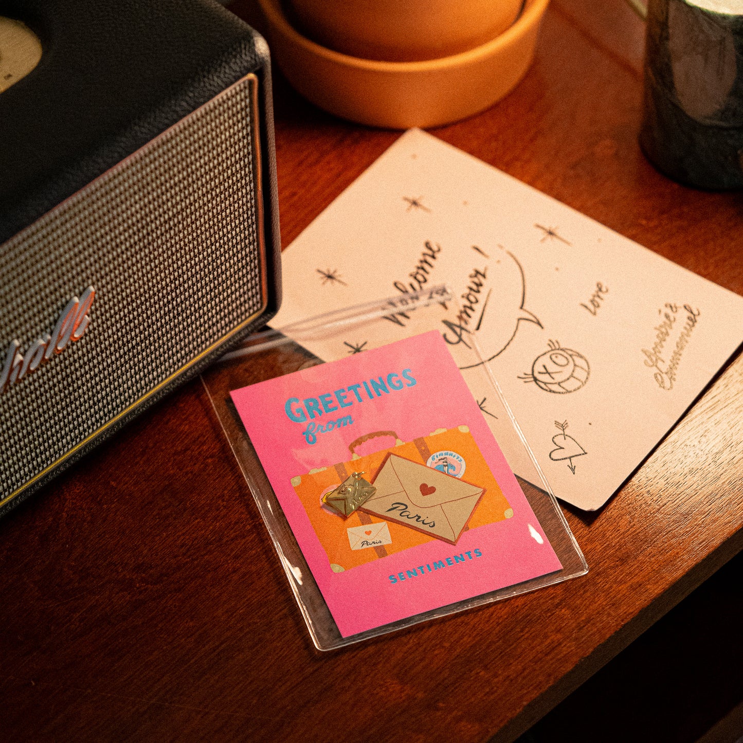 Pack contenant la médaille, l'illustration de Camille et son sticker Paris.